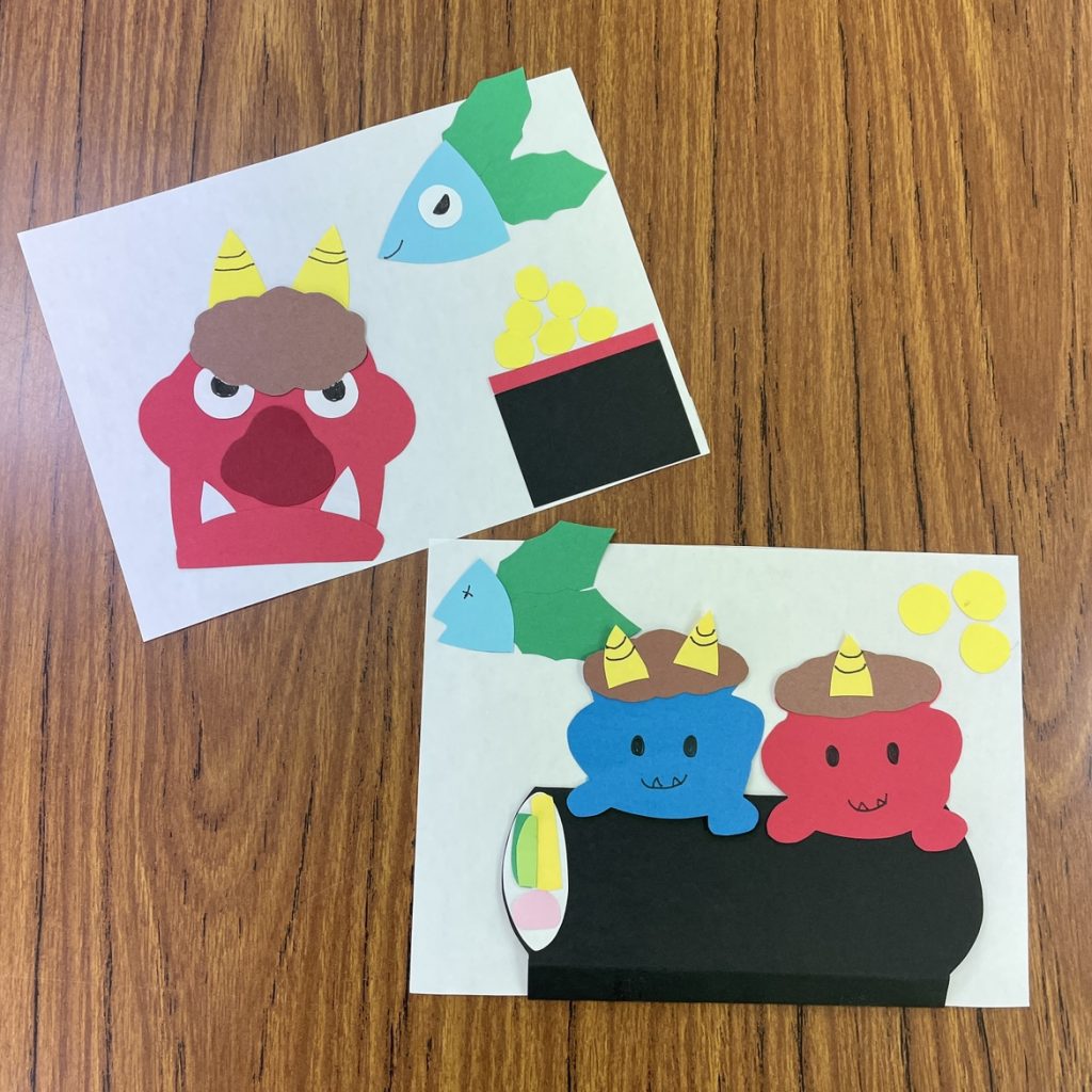 ①社内加工業務では画用紙を切り貼りして写真のような作品を作ることができ、